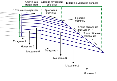 | Ширина выхода на рельеф | Трасса, определяющая местоположение точки обочины основания. | Не обязательно |