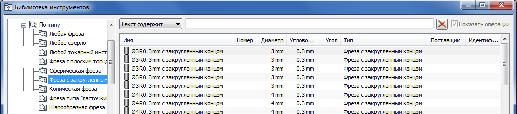 Например, при выборе папки По типу > Фреза с закругленным концом отображаются только инструменты с закругленным торцом.