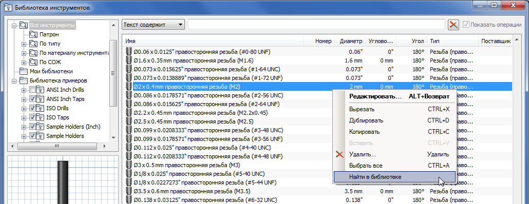 При использовании этого параметра выполняется выбор библиотеки в дереве и поиск необходимого инструмента.