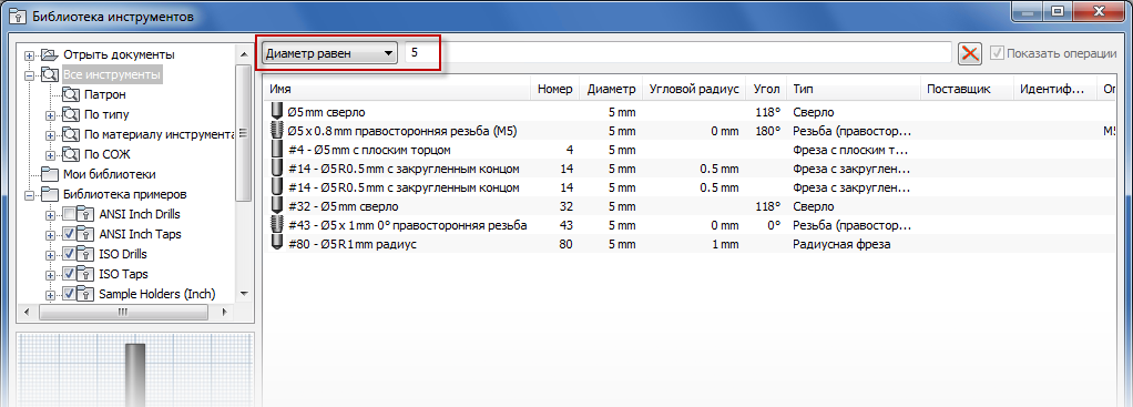 Другие параметры можно использовать, если необходимо ограничить поиск конкретным полем. Например, чтобы найти все инструменты с диаметром 5 мм, выберите параметр Диаметр равен, а затем введите значение 5 в поле поиска.