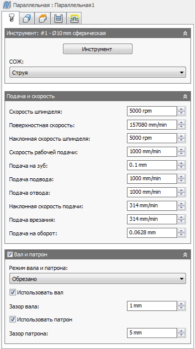 Радиальный и осевой припуски могут быть отрицательным числом. Тем не менее, при использовании сферической или радиусной фрезы с отрицательным значением радиального припуска, превосходящим угловой радиус, отрицательное значение осевого припуска должно быть меньше или равно угловому радиусу.