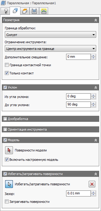Данный параметр включен по умолчанию. Выбранная в настройке модель дополнительно добавляется к поверхностям модели, выбранным в рамках операции. Если снять этот флажок, то траектория перемещения инструмента создается только на поверхностях, выбранных в рамках операции.