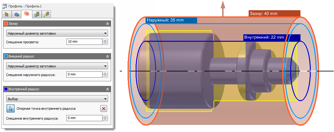 Выбор грани для опорной точки внутреннего радиуса при выполнении операции Обточка профиля