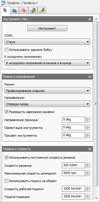 С помощью этого параметра можно выбрать метод обточки ("Профиль" или "Канавка") и соответствующим образом настроить перемещение инструмента при обработке вдоль оси или по окружности, а также направление подвода и отвода.