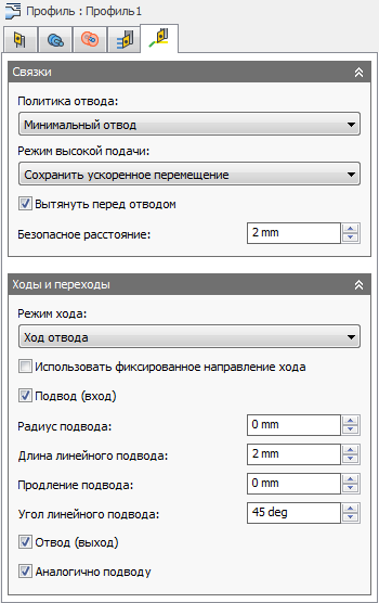 Управление способом отвода инструмента до диаметра просвета после каждого прохода резания или просто отводом на небольшое расстояние от заданного участка обработки. Расстояние определяется значением Безопасное расстояние.