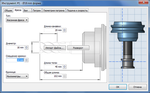 Диалоговое окно "Фасонная фреза" с предварительным просмотром. Пунктирными линиями отображается точка компенсации траектории перемещения инструмента, определяемая диаметром и смещением кромки.