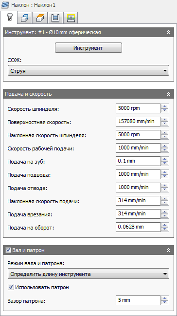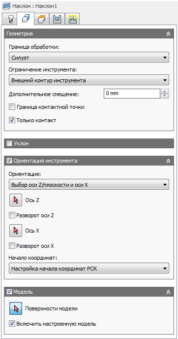 Метод чистовой обработки под наклоном предназначен для участков с большим уклоном, аналогично методу контурной обработки. Однако метод Наклон, как понятно из названия, вместо обработки с постоянным значением Z (как в методе контурной обработки) позволяет постепенно снизить наклон стенки. Таким образом обеспечивается постоянное врезание инструмента. Это может быть важно для определенных материалов, например для керамики.