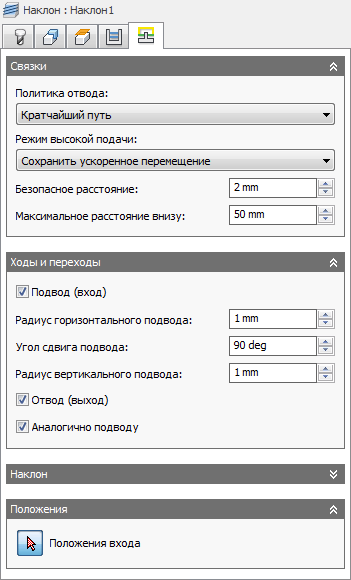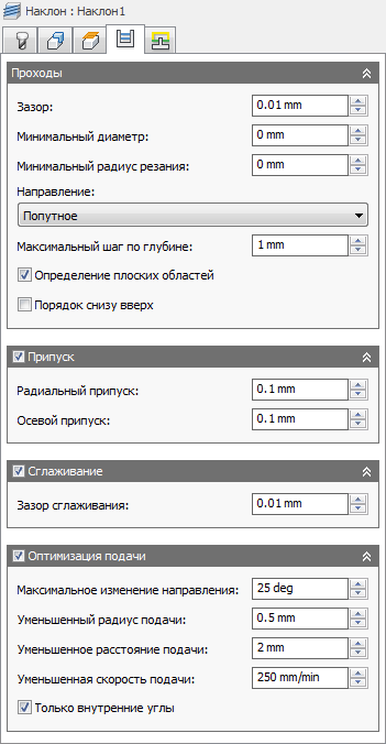 Указание максимального шага понижения на оборот профиля уклона. Этот параметр позволяет ограничить нагрузку на инструмент при выполнении вырезов в полную ширину в процессе создания уклона.