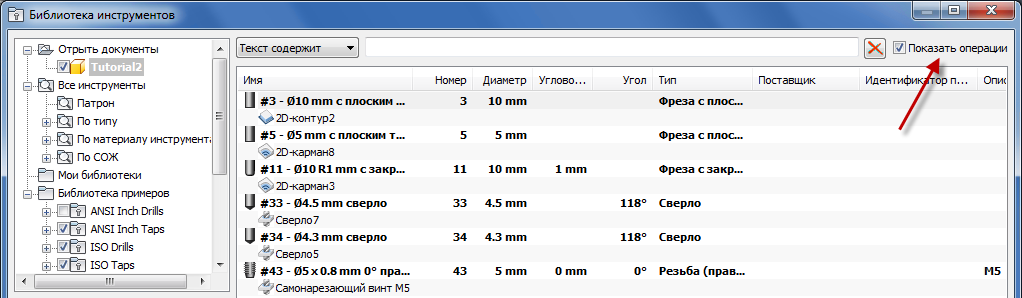 Библиотека инструментов со снятым флажком Показать операции, отображаются только инструменты