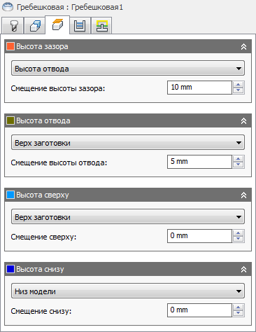 Параметр "Высота отвода" позволяет задать высоту, на которую поднимается инструмент перед следующим шагом резки. Значение высоты отвода должно быть выше значений параметров Высота подачи и Высота сверху. Параметр "Высота отвода" используется вместе с последующим смещением для задания высоты.