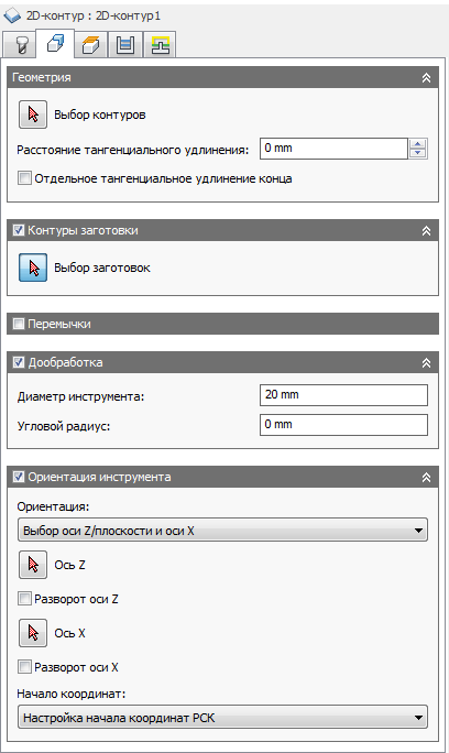 Параметр 2D контур позволяет выбрать исходную геометрию из 2D эскизов или путем выбора граней на геометрии детали. Затем выполняется обработка ребер выбранных граней путем проецирования ребер на плоскость инструмента. Обратите внимание, что этот метод, как и все 2D операции, не защищен от появления выемок, и инструмент может произвести их на любой поверхности или твердом теле. Необходимо убедиться в том, что итоговая траектория перемещения инструмента приводит к желаемому результату.