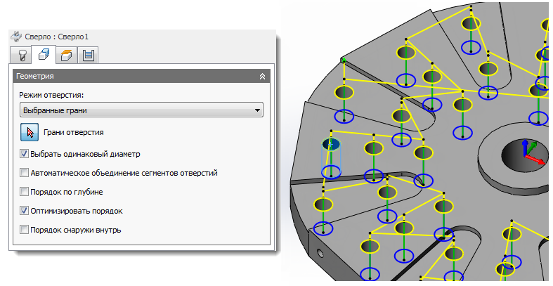 Проще всего использовать элемент сверления можно, выбрав непосредственно для сверления цилиндрические грани отверстий. Таким образом автоматически задается правильная высота заготовки и глубина для каждого отверстия. При этом в одном элементе сверления отверстия могут располагаться на различных плоскостях и иметь различную глубину. Кроме того, активируется параметр Выбрать одинаковый диаметр, который облегчает выбор множества одинаковых отверстий.