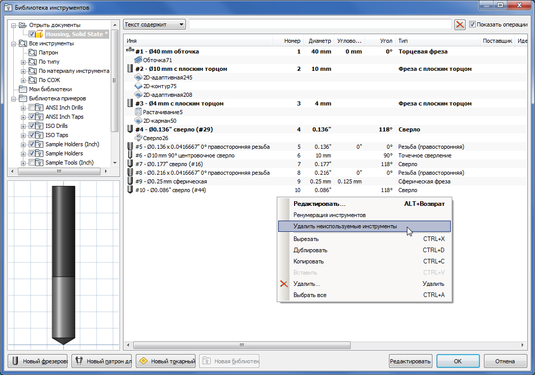 Inventor HSM позволяет без труда удалить все неиспользуемые инструменты, щелкнув правой кнопкой мыши библиотеку или список инструментов и выбрав параметр Удалить неиспользуемые инструменты в контекстном меню.