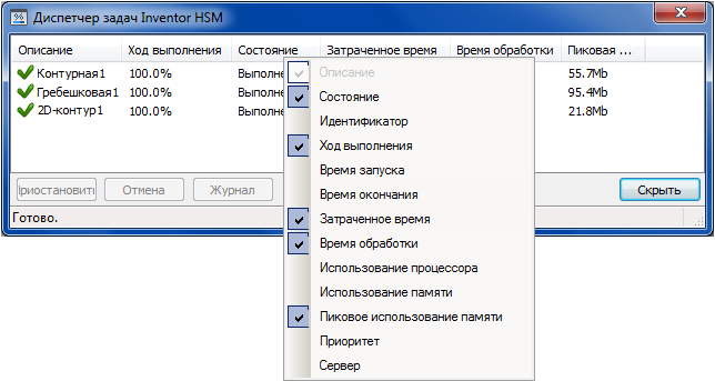 Inventor HSM позволяет продолжить работу в Inventor при создании траектории перемещения инструментов в фоновом режиме. Основным интерфейсом управления созданием траектории перемещения инструмента является Inventor HSM Диспетчер задач Inventor HSM Pro.
