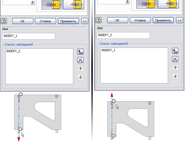 - Создать конструктивную пару зависимости вставки с именем: Вставить_2 в Отверстие 2. Расширить диалоговое окно и создать предпочтительную пару (Вставить_1) в качестве первой записи в списке совпадений.