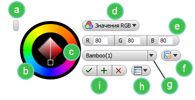 - Значения цвета на основе выбора значений RGB или HSB