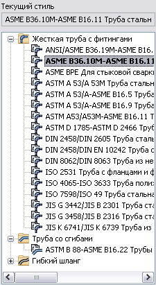 При первом открытии диалогового окна "Стили труб и трубопроводов" список браузера автоматически разворачивается на текущем стиле. Отображаемый текущий стиль зависит от текущей среды труб и трубопроводов. Текущий стиль отображается над браузером стиля в окне ввода, данные в котором доступны только для чтения. Также он выделен жирным шрифтом в списке браузера.