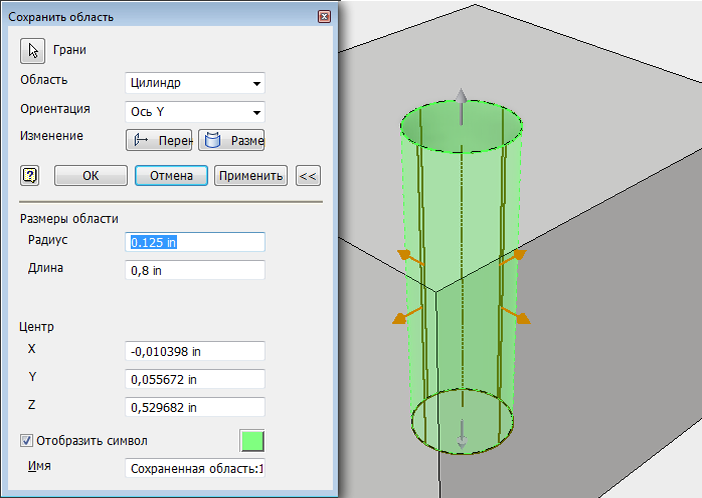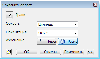 - При необходимости можно развернуть диалоговое окно "Сохранить область" и изменить центральную точку и размеры области вручную. Для цилиндрической области можно также настроить ориентацию. По завершении нажмите кнопку ОК.