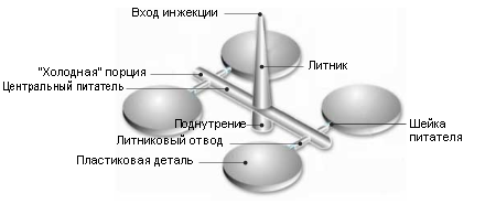 Литниковая система состоит из главного (основного) питателя, вторичного (дополнительного) питателя и третичного питателя.