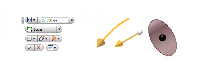 Активное окно накладывается на графическое окно для обеспечения функции непосредственного манипулирования. Обычно оно содержит мини-панель инструментов, содержащую команды, манипуляторы и область ввода значений. Мини-панель инструментов обеспечивает непосредственное и предсказуемое взаимодействие с 3D моделью. Кнопки "OK" и "Отмена", расположенные в нижней части активного окна, используются для подтверждения или отмены операции.