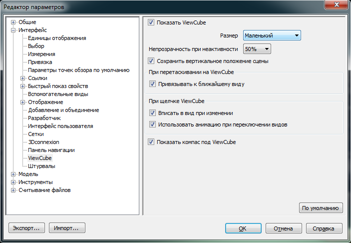 - В редакторе параметров, на странице ViewCube (Видовой куб), в составе узла "Интерфейс" выберите вариант в раскрывающемся списке "Непрозрачность при неактивности".