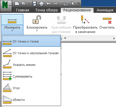 Средства измерения позволяют выполнять измерения между точками на элементах в модели. Все измерения выполняются в единицах отображения. Инструменты измерения доступны на вкладке Рецензирование панель