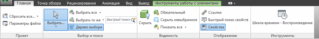Лента делится на вкладки, каждая из которых содержит инструменты для выполнения определенных задач. На вкладках инструменты сгруппированы на панелях в соответствии с конкретными задачами. Некоторые из вкладок являются контекстными. При выполнении некоторых команд вместо панели инструментов или диалогового окна отображается специальная контекстная вкладка ленты. Например, когда вы начинаете выбирать элементы в виде сцены, отображается ранее скрытая вкладка "Инструменты работы с элементами". Если ничего не выбрано, она снова скрывается.