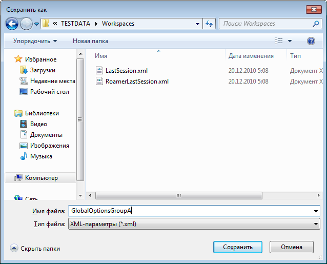 - В диалоговом окне "Сохранение файла" введите имя для файла параметров. Можно выбрать имя существующего файла параметров, чтобы заменить его файлом с измененной конфигурацией.