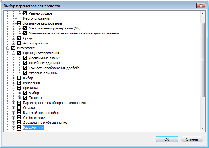 Совет: Для быстрого выбора/отмены всех параметров данной категории используются флажки высшего уровня. Например, при установке флажка "Общие" будут одновременно выбраны все параметры данного узла.