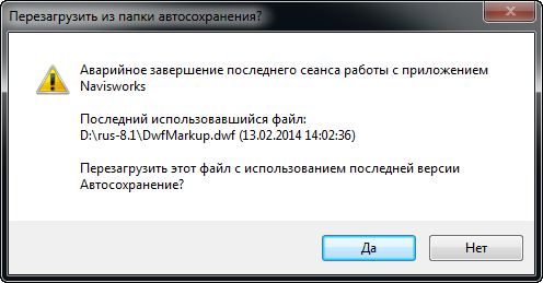 - Запустите Autodesk Navisworks. Автоматически выдается запрос на загрузку последнего файла, с которым выполнялась работа.