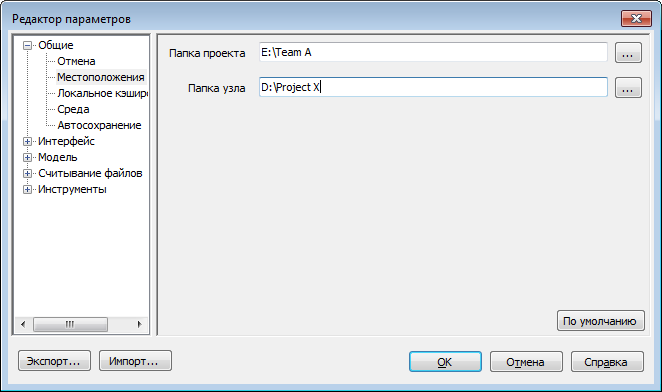 Прим.: При первом запуске Autodesk Navisworks значения параметров извлекаются из папки установки. В дальнейшем в Autodesk Navisworks выполняется анализ профиля текущего пользователя и профиля всех пользователей, после чего проверяются значения параметров в папке проекта и в папке узла. Файлы в "Папке проекта" имеют приоритет.