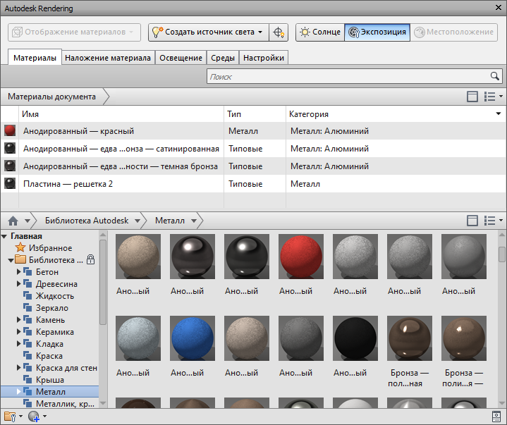 Можно пользоваться как библиотеками материалов от Autodesk, так и создать пользовательские библиотеки для конкретных проектов. Кнопка "Фильтр" позволяет изменить набор отображаемых материалов, размер миниатюр и объем отображаемых данных.
