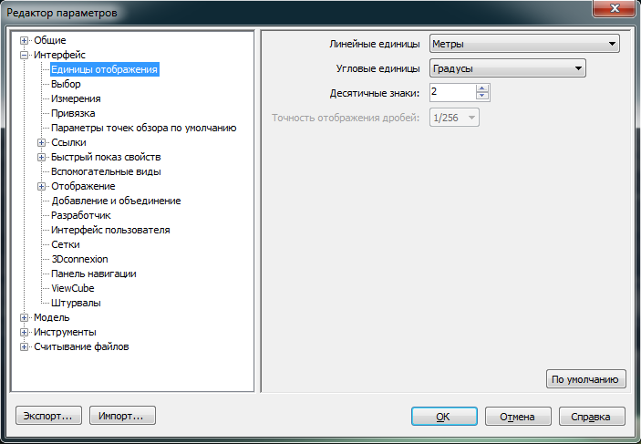 - Разверните узел "Интерфейс" в диалоговом окне "Редактор параметров" и выберите пункт "Единицы отображения".