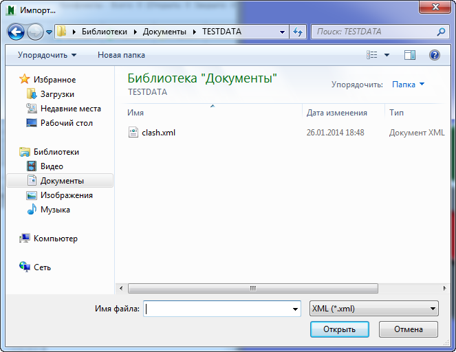 - В диалоговом окне Импорт перейдите к папке, содержащей данные проверки на наличие конфликтов, выберите файл и нажмите кнопку Открыть.