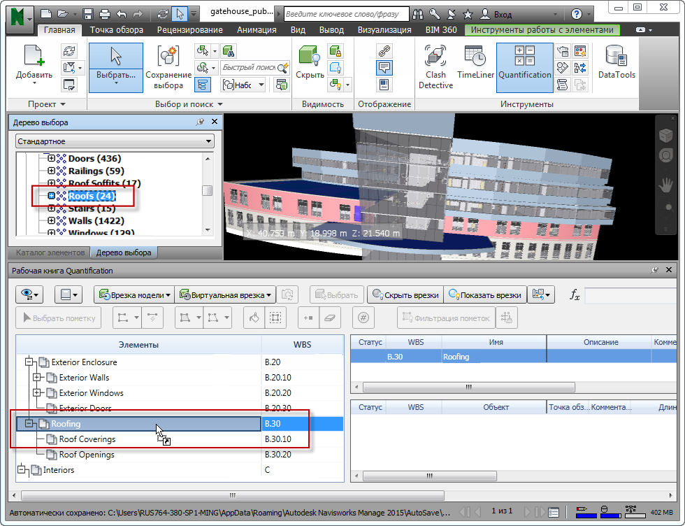 При создании выборки по 3D - модели используются проектные данные, пришедшие с исходными файлами. Приложение извлекает объекты из модели и отображает их в виде элементов в рабочей книге Quantification.
