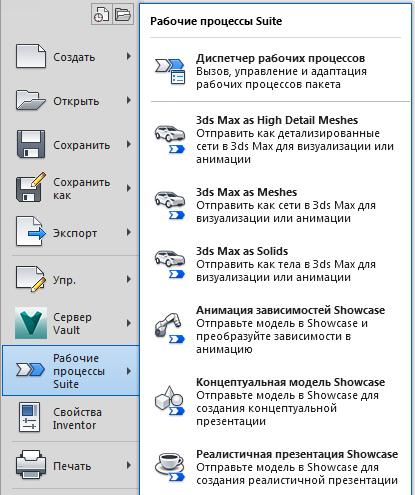 Рабочий процесс пакета представляет собой механизм экспорта инженерного проекта из исходного продукта Autodesk в целевой продукт для последующей детальной визуализации или анимации. Настройки в рабочем процессе автоматически преобразуют объекты в проекте для презентации в 3ds Max или Showcase. Например, рабочий процесс внешней визуализации в 3ds Max выполняет визуализацию внешних поверхностей проекта здания, включая свет и тени. Рабочий процесс анимации зависимостей в Showcase отображает механическую сборку в движении, преобразуя зависимости диапазона в анимированные объекты. Рабочие процессы можно использовать для подготовки проекта к проверке и создания убедительных презентаций.