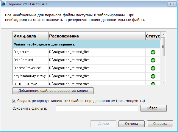 - Нажмите кнопку "Далее". На странице "Резервное копирование при переносе проекта" отображается ход выполнения резервного копирования, а также сообщается об успешном создании резервной копии каждого из файлов.