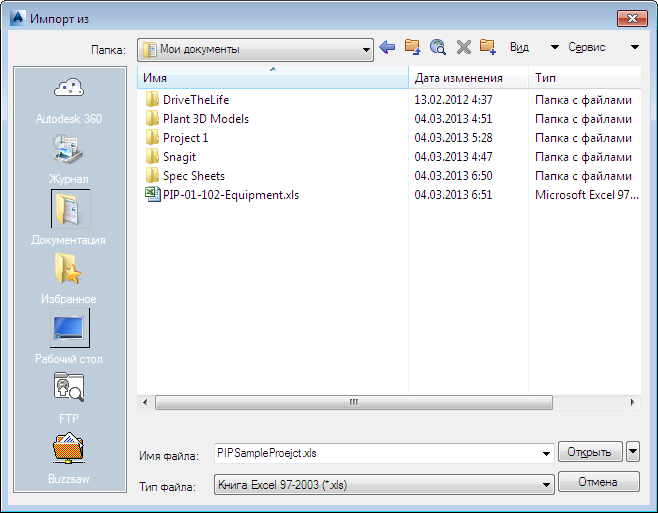 Открытие диалогового окна "Импорт данных" или "Выбор листа", в зависимости от того, что импортируется: данные проекта, данные чертежа или отчет о проекте.