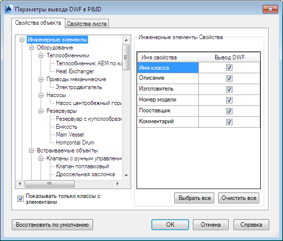 - В диалоговом окне "Параметры вывода" на вкладке "Свойства объекта" установите флажок "Показывать только классы с элементами".