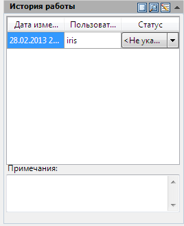 Можно ввести статус истории работы и примечания для любого чертежа в области "История работы" Диспетчера проектов.