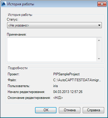 Также можно ввести статус и примечания в диалоговом окне "История работы", если администратор проекта настроил отображение диалогового окна при открытии или закрытии чертежа. Обратите внимание, что оно не является средством хранения, получения или контроля версий чертежа.