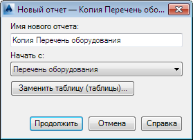 - В диалоговом окне "Новый отчет" введите имя для нового отчета (например, Новый перечень оборудования).
