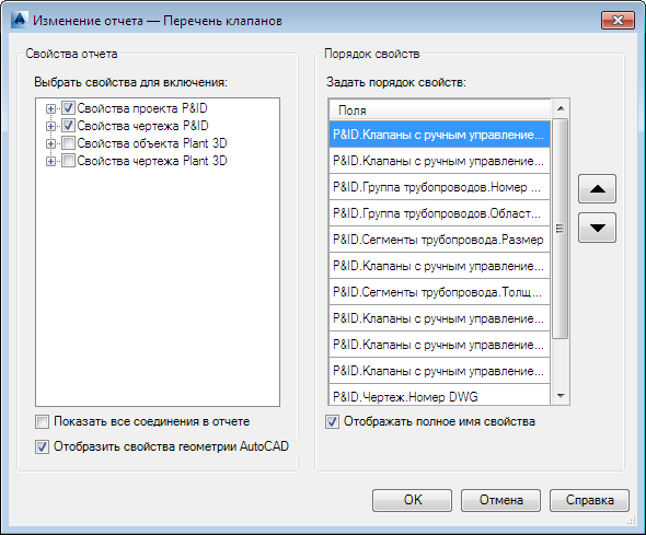 В случае создания шаблона отчета Plant 3D можно указать свойства объекта или чертежа Plant 3D и соответствующим образом их упорядочить. Данные Plant 3D включаются в отчет только при условии, если в проекте существует соответствующий объект P&ID с идентичным идентификатором.