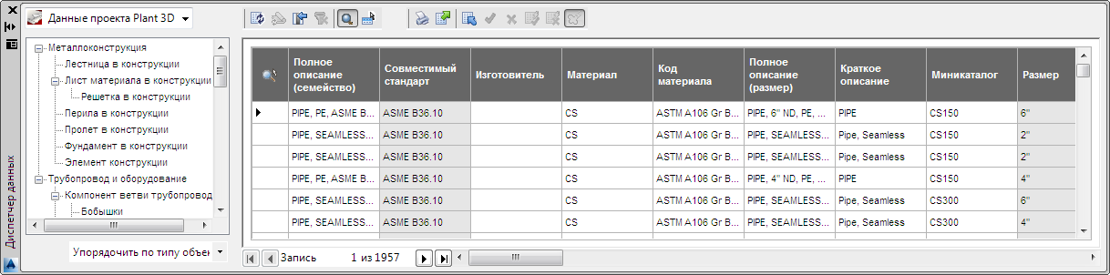 Диспетчер данных позволяет работать с данными Plant. С помощью Диспетчера данных можно просматривать, изменять, экспортировать и импортировать данные чертежей и проектов, а также создавать отчеты.