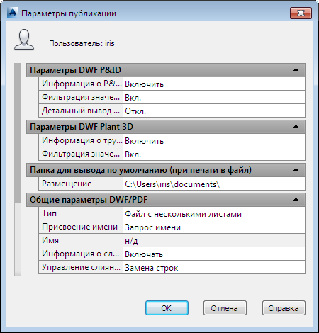 Информация о трубопроводе. Указывает, включаются ли данные, связанные с трубопроводом, в публикуемый выходной файл DWF. Следует указать "Включать" или "Не включать". Можно также щелкнуть это поле и нажать кнопку [...], чтобы открыть диалоговое окно "Параметры DWF Plant 3D".