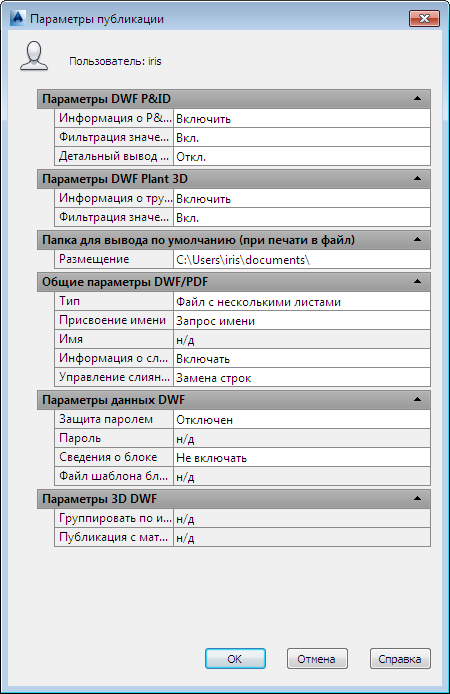 Раздел позволяет управлять поведением публикации DWF-файла.