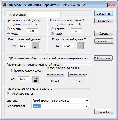 Внизу диалогового окна находится опция Сейсмический расчет - ANSI/AISC 360-05 . При выборе этой опции программа проверяет дополнительные условия, которые должны выполняться для стальных нагруженных элементов, подверженных сейсмическим нагрузкам. Требования, которые должны выполняться для учета сейсмических нагрузок, определяются нормами ANS/AISC 341-05 – "Указания к сейсмическому расчету стальных конструкций - Приложение No.1". Проверка стальных элементов включает проверку их сечений по американским нормам стали ANSI/AISC 360-05 - "Инструкция по сейсмическому расчету стальных конструкций" с применением дополнительных ограничений, указанных в ANS/AISC 341-05 - "Указания к сейсмическому расчету стальных конструкций".