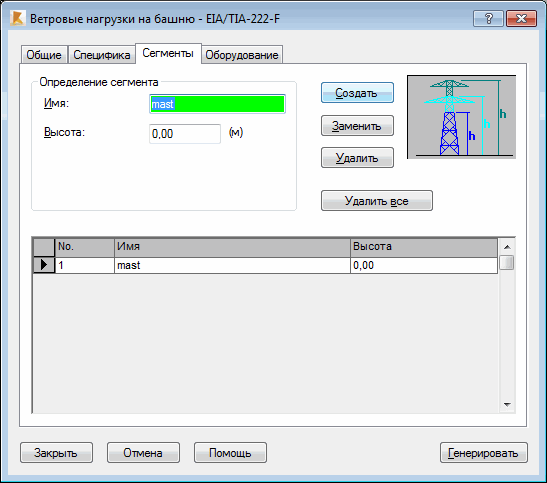 После открытия диалогового окна Ветровые нагрузки на башни и перехода на вкладку Сегменты на экране появляется следующее диалоговое окно.