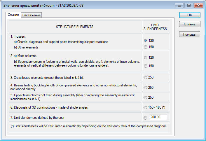 Диалоговое окно предельного значения коэффициента гибкости используется для определения коэффициента гибкости для элементов сжатия и натяжения. Оно открывается при нажатии на кнопку "Определить" в диалоговом окне Конфигурация.