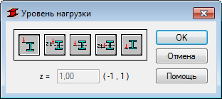 Для проверки условий потери устойчивости необходимо задать положение нагрузки на сечении стержня. Положение нагрузки задается в системе координатных осей поперечного сечения стержня. В случае, когда потеря устойчивости возникает при изгибе стержня только в плоскости XZ, положение силы определяется одной координатой. Координата задается в относительных значениях, так что ее величина находится в интервале <-1.0,1.0>. Если нагрузка приложена в характерной точке сечения (нижняя полка, верхняя полка и т. д.), достаточно выбрать соответствующую иконку и значение координаты будет принято автоматически.